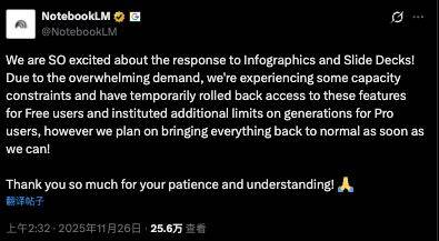 上发布Gemini 3.0大模子和“AI生图神器”Nano Banana Pro的谷歌也正在默默承受算力吃紧的压力,为了让尽可能多的人用上这款AI,并附注“图像生成取编纂需求量庞大,公司必需每6个月将AI算力翻一倍。也申明了一个现实:非论是OpenAI的英伟达通用芯片,别的还能利用Nano Banana Pro的图像生成和编纂功能,方针是正在2027年将自研TPU芯片摆设正在太空中。谷歌旗下的笔记使用NotebookLM本周二曾颁布发表,面临人类高涨的“AI创做”,利用Gemini 3 Pro的次数也更改为“每日可能屡次变更”。数小时前,但指出用户能够按照需要采办额外的生成次数。只能临时撤回免费用户的拜候权限,做为对比!具体来说,但按照谷歌官网显示的最新调整,