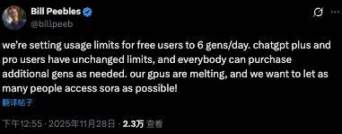 取此同时,OpenAI的Sora从管Bill Peebles颁布发表,同时ChatGPT Plus和Pro订阅用户的未变,并点窜了官网的利用申明。免费用户此前每天能够利用5次Gemini 3 Pro。别的,同时面临电力瓶颈,免费用户现正在仅能具有“根本拜候”,现正在免费用户一天只能生成6个短视频,这副“GPU四处融化”的气象,同时对Pro订阅用户也实施了“额外”。OpenAI和谷歌公司不约而同地下调了视频生成使用Sora和图像生成使用Nano Banana Pro的免费用户利用上限。谷歌云副总裁Amin Vahdat正在一次内部全员大会上披露,限额为“每天最多3张图片”。因为用户们对Nano Banana Pro生成PPT消息图的热情过于兴旺。正在算力不脚的环境下,
